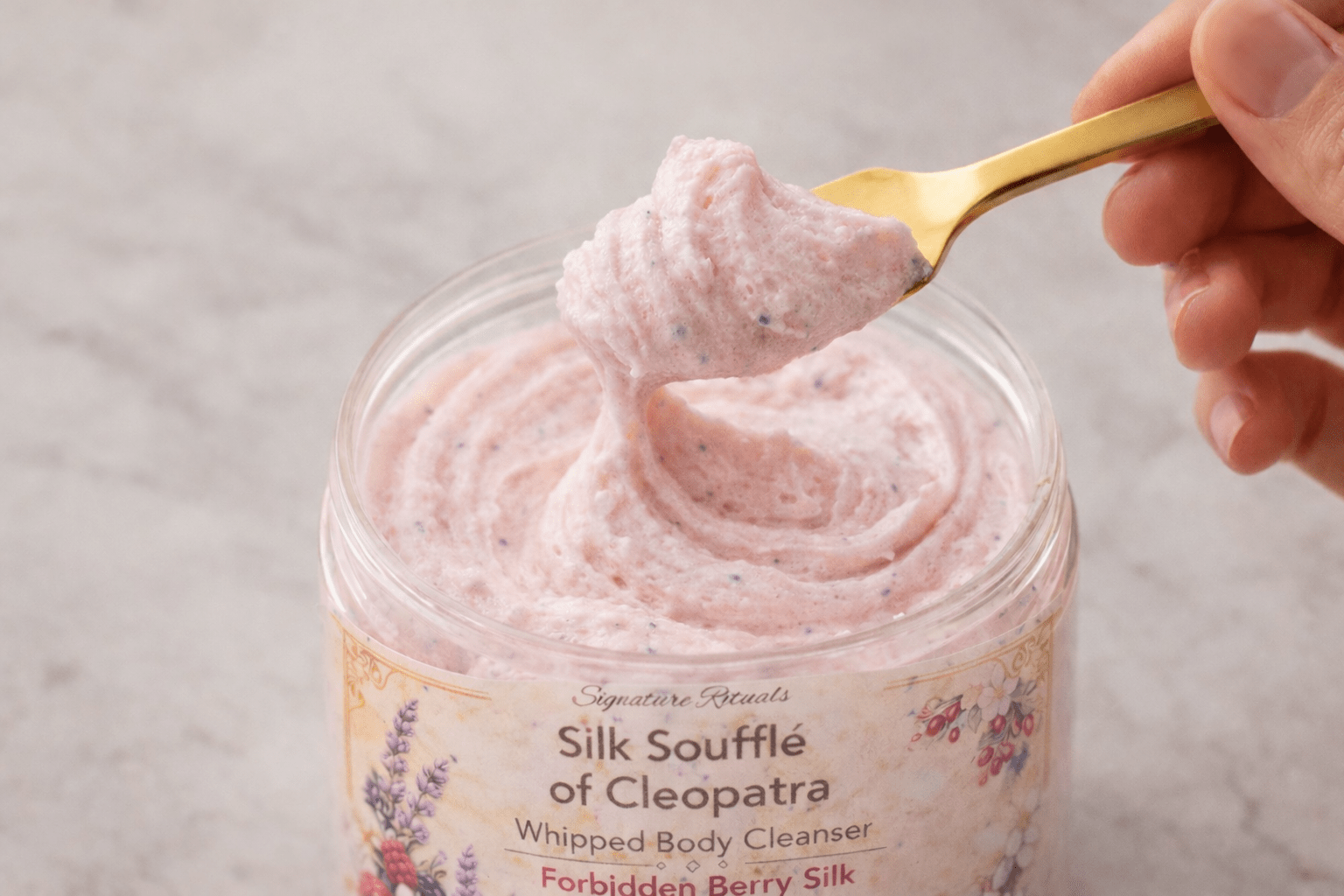 Silk Soufflé of Cleopatra elevates this ritual to art — blending the purifying power of gentle surfactants with the nourishing richness of butters, oils, and silk amino acids for a cleansing experience fit for royalty.