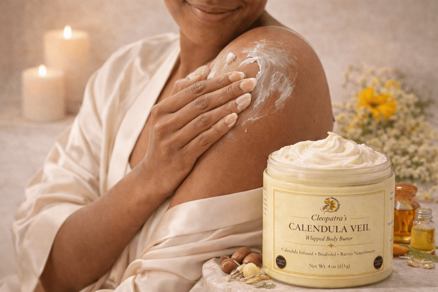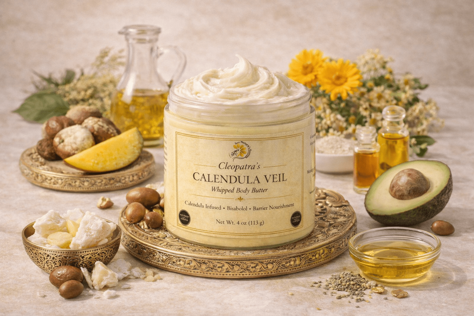 Inspired by the timeless beauty rituals of Cleopatra, Cleopatra’s Calendula Veil Whipped Body Butter transforms daily moisturization into a sacred act of restoration. This decadent botanical treatment envelops the skin in a veil of calming calendula, restorative butters, and clinically respected lipid-supporting oils designed to replenish the skin barrier and restore luminous softness.
