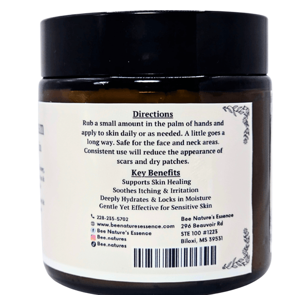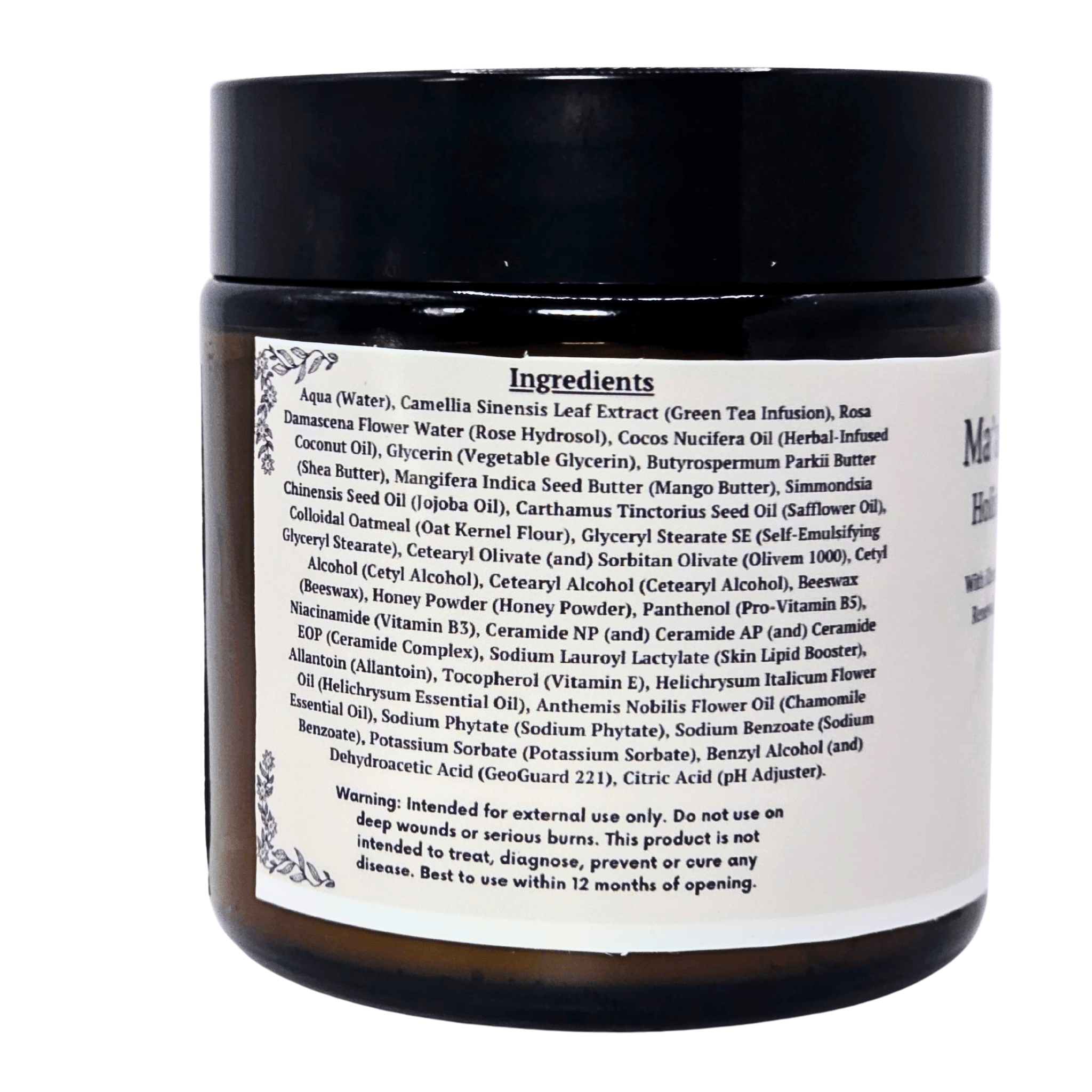 Aqua (Water), Camellia Sinensis Leaf Extract (Green Tea Infusion), Rosa Damascena Flower Water (Rose Hydrosol), Cocos Nucifera Oil (Herbal-Infused Coconut Oil), Glycerin (Vegetable Glycerin), Butyrospermum Parkii Butter (Shea Butter), Mangifera Indica Seed Butter (Mango Butter), Simmondsia Chinensis Seed Oil (Jojoba Oil), Carthamus Tinctorius Seed Oil (Safflower Oil), Colloidal Oatmeal (Oat Kernel Flour), Glyceryl Stearate SE (Self-Emulsifying Glyceryl Stearate), Cetearyl Olivate (and) Sorbitan Olivate (Olivem 1000), Cetyl Alcohol (Cetyl Alcohol), Cetearyl Alcohol (Cetearyl Alcohol), Beeswax (Beeswax), Honey Powder (Honey Powder), Panthenol (Pro-Vitamin B5), Niacinamide (Vitamin B3), Ceramide NP (and) Ceramide AP (and) Ceramide EOP (Ceramide Complex), Sodium Lauroyl Lactylate (Skin Lipid Booster), Allantoin (Allantoin), Tocopherol (Vitamin E), Helichrysum Italicum Flower Oil (Helichrysum Essential Oil), Anthemis Nobilis Flower Oil (Chamomile Essential Oil), Sodium Phytate (Sodium Phytate), Sodium Benzoate (Sodium Benzoate), Potassium Sorbate (Potassium Sorbate), Benzyl Alcohol (and) Dehydroacetic Acid (GeoGuard 221), Citric Acid (pH Adjuster).